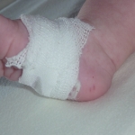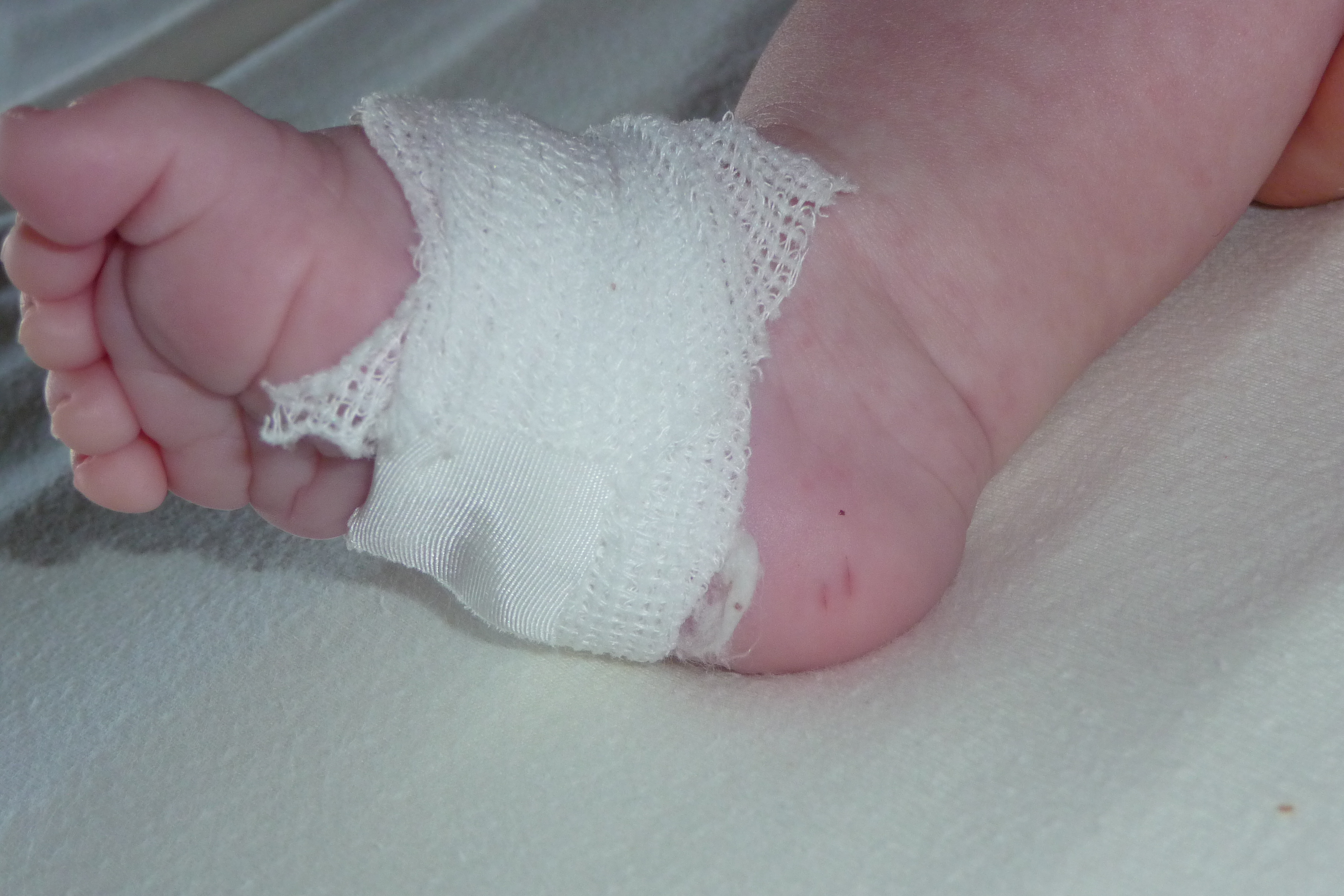 Een heel onaardige meneer kwam vervolgens langs en maakte twee sneetjes in mijn rechtervoetje. Het bloed ving hij op in buisjes. Ik ben een echte bikkel dus ik heb hem niet laten merken dat het eigenlijk heel erg pijn deed. Helaas, deze onaardige meneer bleek nog een beetje onaardiger te zijn. Hij had geen mooie Winnie de Poeh-pleister voor mij! Ik moest het maar doen met een gaasje en plakband. De service in ziekenhuizen is ook niet meer wat het ooit geweest is, zeg ik je.